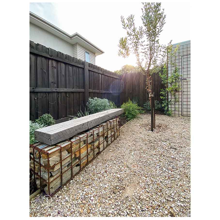 - 'Filetti' Italian stone paving feature to add textural interest and warmth to the front entry. (Filetti stone also used within rear gabion bench seat for design continuity).